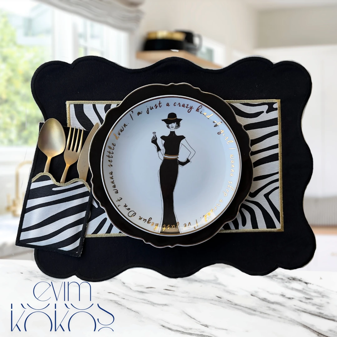 Zebra deseninin modern çizgileriyle tasarlanan bu Amerikan servis seti, sofralarınızı sıradanlıktan çıkararak tarzınızı yansıtmanızı sağlar. Dertsiz kumaşı sayesinde uzun ömürlü kullanım sunar ve leke tutmaz özelliği ile temizlik kolaylığı sağlar.